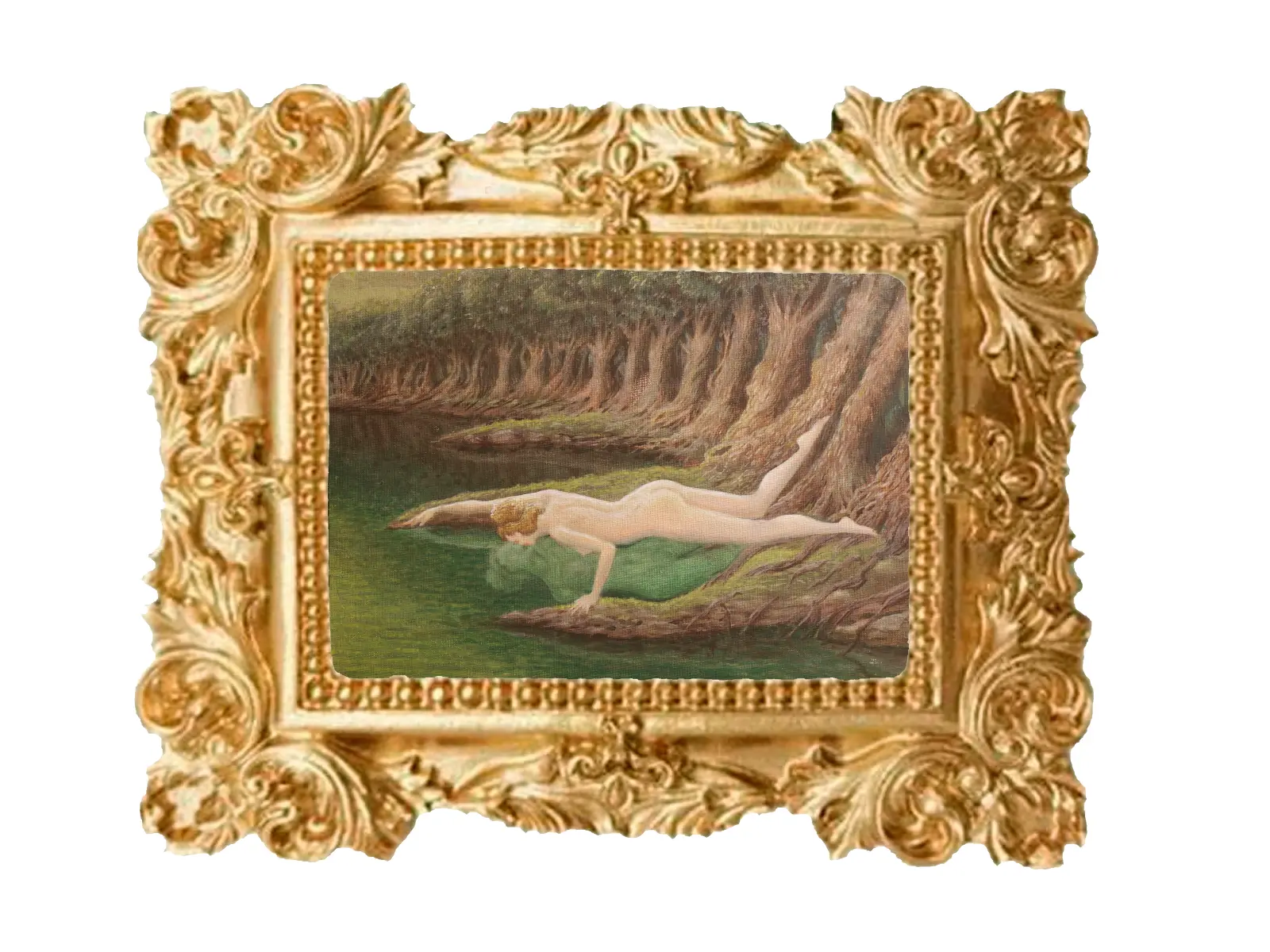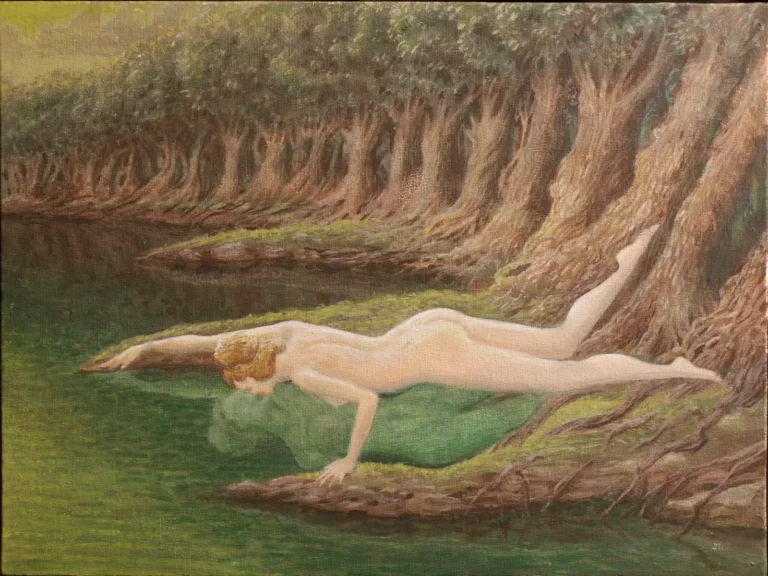 In Greek mythology, Echo was in love with Narcissus, but Narcissus was cursed to only love himself. He died just admiring his own reflection in a pool of water. I thought Echo would return to where Narcissus had died and try to see his reflection in the water. Imitating her lost love, Echo tries to kiss him, only to kiss an illusion of herself.